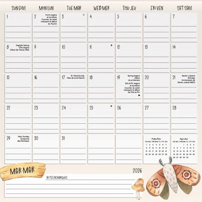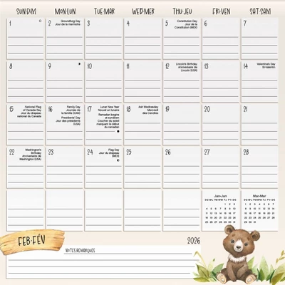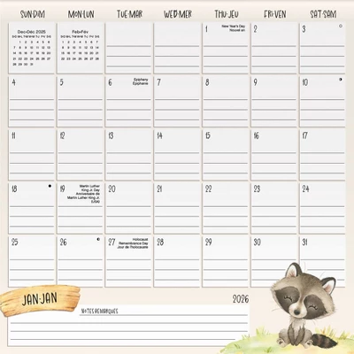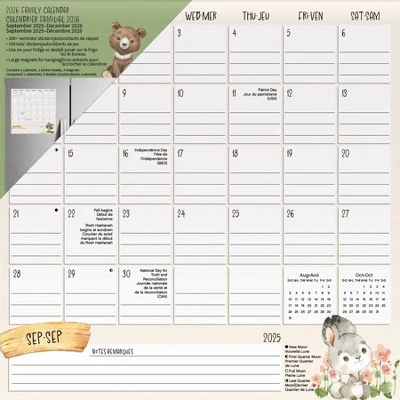 - This 2026 Animals (Bilingual French) Magnetic Family Calendar features tear-off monthly pages with notes sections for September 2026 to December 2026