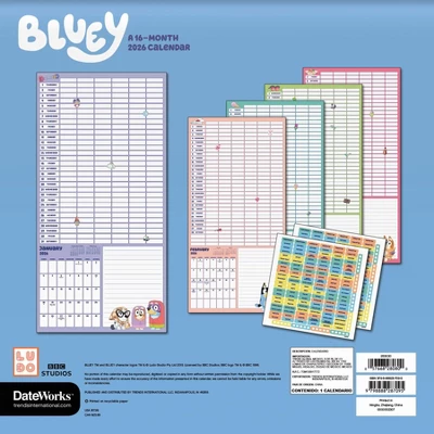 - This 2026 Bluey Wall Calendar with Reminder Stickers features monthly pages for January to December 2026, as well as the last 4 months of 2025
