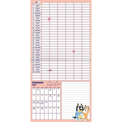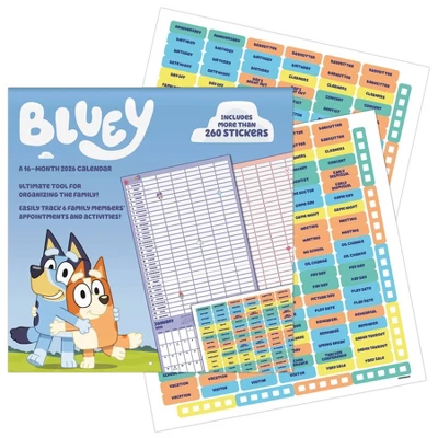 Follow the adventures of lovable and inexhaustible Bluey, a seven-year-old Blue Heeler puppy who learns all about the world with her sister Bingo, her parents Bandit and Chilli, and her friends in her own TV show. Join in their imaginative play and learn life lessons, too, in the 2026 Bluey Calendar! Sixteen-month sticker wall calendars feature monthly pages for January to December 2026, as well as a page combining the last four months of 2025. Each monthly page highlights federal holidays and moon phases, with generous daily blocks for jotting down tasks and appointments. Includes more than 250 stickers to help you stay organized and have fun doing it. Printed on premium paper certified by the Forest Stewardship Council. Perfect for hanging on your wall, corkboard or bulletin board at home, school or the office.
