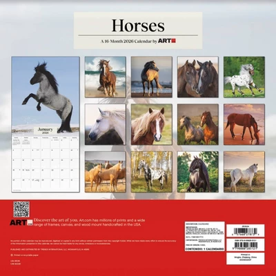 The epitome of independence, freedom, and confidence, horses stir a longing in many of us to connect with them and the natural splendor that is their playground. Celebrate their stunning beauty and power all year long with the majestic equine images of the 2026 Horses Calendar. Sixteen-month wall calendars feature monthly pages for January to December 2026, as well as a page combining the last four months of 2025. Each monthly page includes federal holidays and moon phases, with sufficient daily blocks for jotting down tasks and appointments to help you stay organized. Features 13 high-quality images printed on premium paper certified by the Forest Stewardship Council. Perfect for hanging on your wall, corkboard or bulletin board at home, school or the office.