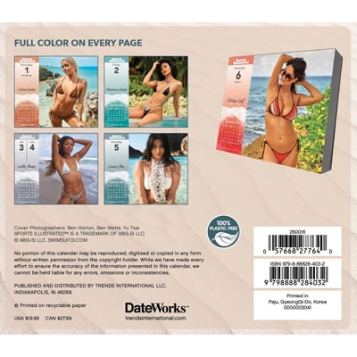 It’ll be just like you were there on the beach with the hottest women around in more than 300 images from the Sports Illustrated magazine swimsuit photo shoots in the world’s most exotic places. Pack your sunglasses and don’t forget the sunscreen with this 2026 Sports Illustrated Swimsuit Calendar. The perfect gift for someone on your list, or for yourself. Day-at-a-time box calendars feature over 300 full-color, tear-off pages with unique designs for every day of the year (Saturday/Sunday combined to create weekend pages). Highlights federal holidays and moon phases to help you stay organized. Includes an eco-friendly, plastic-free easel for easy display on your desk, table or shelf at home, school or the office.