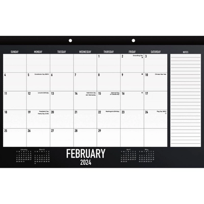 This 2024 Classic Black Calendar will keep you well-organized with its simple black design. The large grid spaces and extra month grids across the bottom give you plenty of room to write down important reminders, appointments, activities, due dates, or notes. Desk Calendars are the perfect size to keep on your office desk or at your workspace. Or, if you prefer, you can hang this calendar on the wall with the included drill holes. These DateWorks Calendars feature a page for each month in 2024, as well as the last four months of 2023. The perforated pages make it easy to tear the calendar page off at the end of the month and reveal the next monthly page.