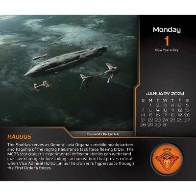 Jump into hyperspace this year with this 2024 Star Wars Calendar, brimming with incredible facts about your favorite Star Wars characters, creatures, vehicles, droids, locations, and technology. Spanning the entire movie series, this calendar is sure to test your knowledge about a galaxy far, far away. Day-at-a-Time Calendars feature full-color, page-a-day designs with Saturday and Sunday combined, and a sturdy, self-standing easel making it the perfect addition to your office desk decor. To help reduce waste, DateWorks Day-at-a-Time Calendars are now plastic-free! The former plastic easel is now a sturdy, eco-friendly gray board material. DateWorks 2024 Calendars are great for staying organized and productive all year long. They also make a perfect gift for anyone on your list!